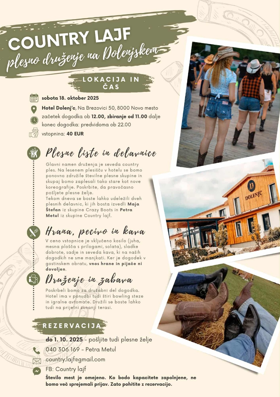 Nakon godinu i pol vraća se Country lajf – cjelodnevno plesno druženje. Ovaj put na drugoj lokaciji, ugostit će nas Hotel Dolenj'c.