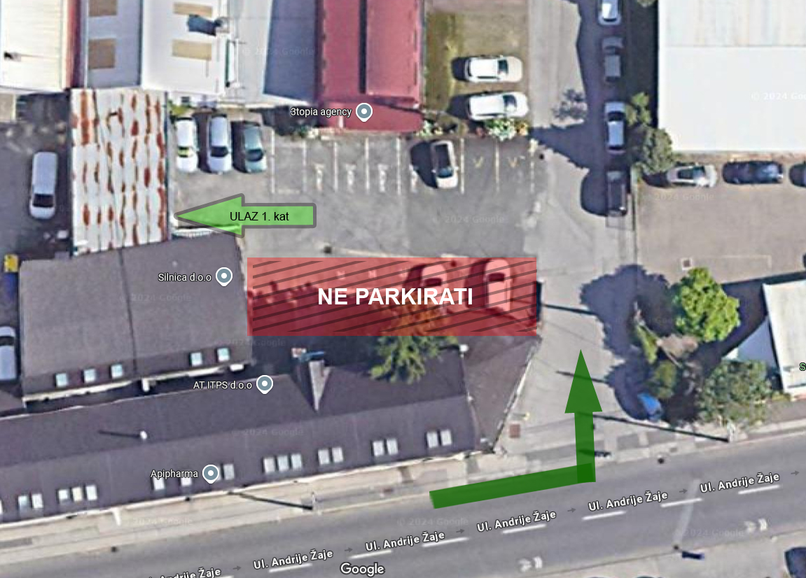 Obzirom da se parking dijeli sa tvrtkom koja prima klijente i navečer, molimo ne parkirati na lijevoj strani dvorišta (označeno crvenom bojom na slici ispod).